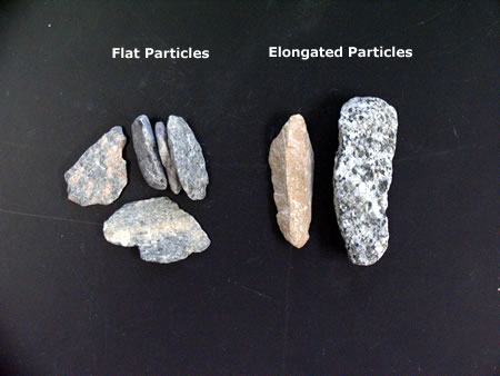 Overview The flat and elongated particle test is used to determine the dimensional ratios for aggregate particles of specific sieve sizes. This characterization is used in the Superpave specification to identify aggregate that may have a tendency to impede compaction or have difficulty meeting VMA specifications due to aggregate degradation. Flat or elongated particles (Figure 36) tend to lock up more readily (rather than reorient) during compaction making compaction more difficult. They also have a tendency to fracture during compaction along their weak, narrow dimension, which can effectively make aggregate gradation finer and possibly cause lower-than-expected